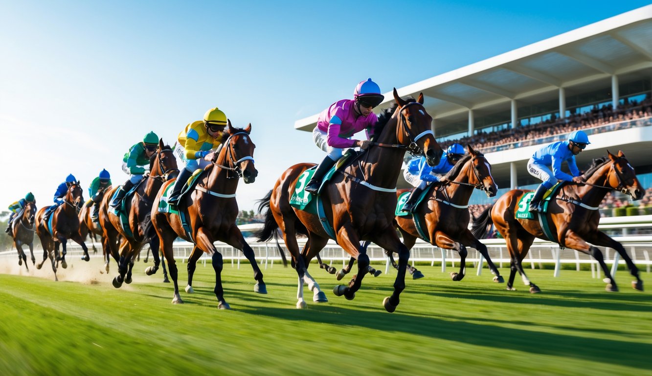 Adegan balap kuda dengan beberapa kuda dan joki yang sedang berlari di lintasan hijau dengan penonton di tribun.